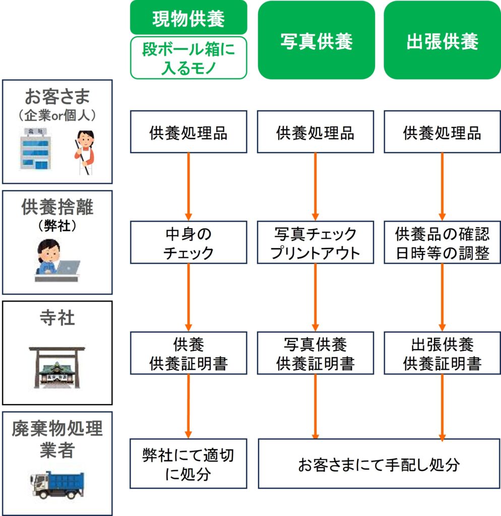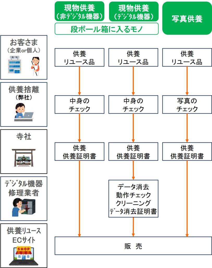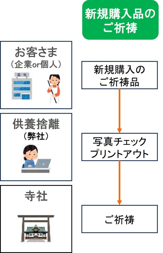 サービス内容 供養捨離は、以下の3つのサービスがあります。1.供養リユースサービス供養の儀式(魂抜き)したモノを供養リユースショップで販売するサービスです。2.供養処理サービス供養の儀式(魂抜き)したモノを廃棄するサービスです。3.祈祷サービス新規に購入してこれから使うモノに対して安全、繁栄等を願うご祈祷を行なうサービスです。なお、ご供養およびご祈祷を行なっている様子は、すべて写真に撮り送付させていただきます。 供養リユースサービスの流れ 供養処理サービスの流れ 祈祷サービスの流れ 供養リユースサービスの流れ ご供養した上で、供養リユースショップで販売するサービスです。このサービスは、段ボール箱に入れて送っていただくことが基本になります。ただし、大きなモノは写真にて供養します。なお、デジタル機器については、ご供養後に専門業者にて「データ消去、動作チェック、クリーニング」を行ないます。 供養品を段ボール箱にて、ヤマト便にて発送していだだきます。なお、段ボール箱に入らないモノは、写真でご供養します。以下のメールアドレスに写真を送付してください。 Email:contact@kuyoshari.com 段ボール箱の中身、もしくは写真をチェックします。 寺社にて、丁寧にご供養します。なお、ご供養後に「供養証明書」を送付します。 デジタル機器については、専門業者にて「データ消去、動作チェック、クリーニング」を行ないます。また、「データ消去証明書」を送付します。 供養したモノについては、弊社の「供養リユース品ECサイト(くよりショップ)」にて販売します。仮に、売れ残った場合は、弊社負担にて処理します。 売上代金の配分について お客さま:売上代金の60%弊社の手数料:売上代金の40%一般的なリユースショップは、売上代金の20%~50%がお客さまの配分になります(一般的なリユースショップの粗利益は50%~80%)。よって、お得な配分となっています。 供養処理サービスの流れ 供養処理サービスには、以下の3つパターンがあります。1.現物供養供養するモノをを段ボール箱に入れて、ヤマト便にて発送いただき現物で供養します。2.写真供養段ボール箱に入らないような大きなモノは、供養するモノの写真を送っていただき供養します(写真にも念が宿ると言われています)。3.出張供養住職もしくは神主が出張して供養します。ヤマト便で運べない大きなモノは、「写真供養」もしくは「出張供養」にて対応します。 供養品を段ボール箱でヤマト便にて発送いただきます。なお、段ボール箱に入らない大きなモノは、写真で供養します。以下のメールアドレスに写真を送付してください。また、出張供養をご希望の場合も、同様の家メールアドレスからご依頼ください。Email:contact@kuyoshari.com 段ボール箱の中身もしくは写真をチェックします。出張供養の場合は、供養品の確認、日時等の調整を行ないます。 寺社にて、もしくは出張にて丁寧にご供養します。また、供養後に「供養証明書」を送付します。 現物供養したモノで、不燃物(金属・ガラス・陶器・プラスチック等)が含まれるものは、供養の儀式(魂抜き)ののち、責任を持って専門業者等へ委託、または適切に分別・処分いたします。 なお、写真供養、出張供養の場合は、お客さまにて処分いただきます。 新規購入品のご祈祷サービスの流れ 新たに購入し役目を担うモノの安全と円滑な活躍を祈祷するサービスを提供する。 僧侶や神職により、安全、無事故、繁栄等を願うご祈祷を行ないます。 万が一の事故や紛失などを考慮し、ご祈祷は原則、写真にて行ないます。 ご祈祷を希望する新規購入品の写真を以下のメールアドレスに送付してください。Email:contact@kuyoshari.com。 写真をチェックします。 寺社にて、丁寧ににご祈祷します。また、祈祷後に「祈祷証明書」を送付します。 ご協力いただけるお寺 歓喜山浄興寺千葉県印西市木刈にある浄土真宗の真宗浄興寺派の寺院です。真宗浄興寺派は浄土真数の中でも最古の歴史と由緒ある宗派です。本山・浄興寺は親鸞聖人が建立した寺院であり、780年に及ぶ歴史があります。
